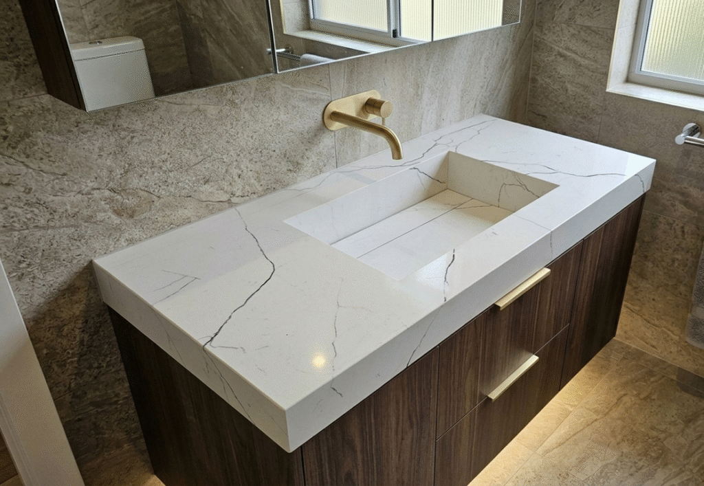 - Encimeras de Cuarzo: El estándar de diseño y sofisticación para cocinas internas y baños.